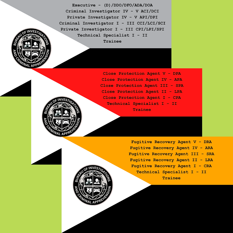 Serving as a private investigator, criminal investigator, close protection agent, or a fugitive recovery agent is unlike most professions, while on duty mid-ranked and or higher-ranked personnel can become incapable, ill and or killed at any moment due to several factors. In this instance, without a concrete chain of command, less experienced personnel would be left without direction. To counteract this, BICA uses a title/rank structure to assure that someone is in command at all times. For example, if one of the Supervisory is incapable of serving, the next highest-ranking personnel will take command.